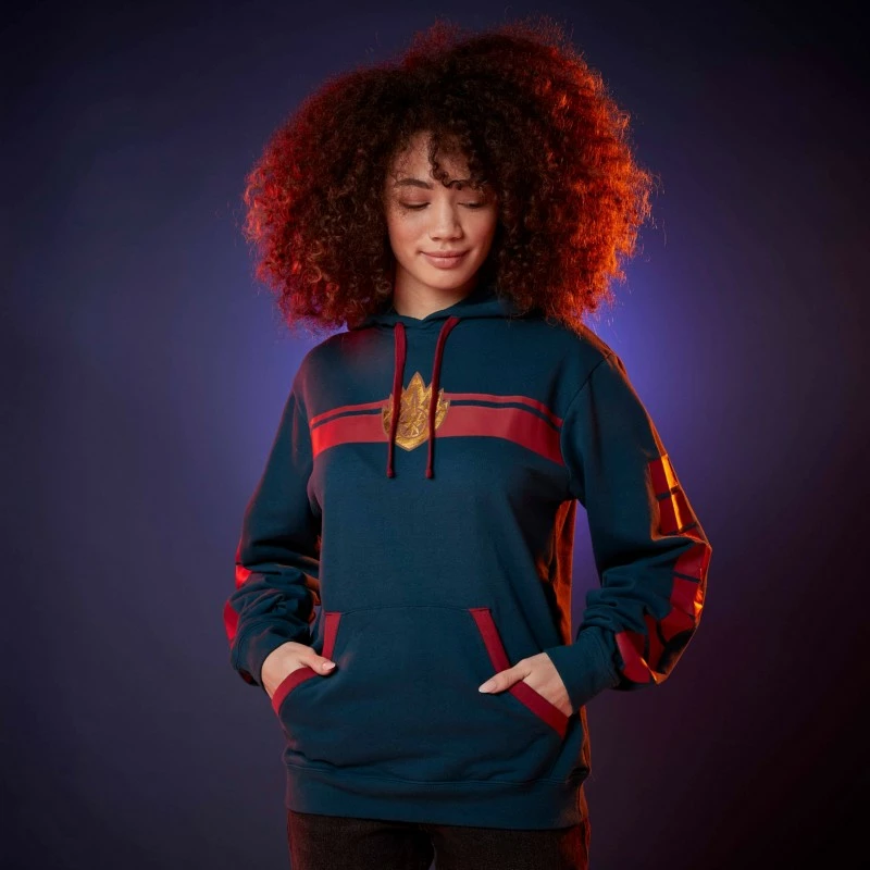A truly iconic outfit, this pullover hoodie features a golden Guardians of the Galaxy symbol front and centre. The bold geometric design across the chest and along the sleeves befits the tough team led by the fearless Star-Lord. With its lined hood and fleece fabrication interior, this blended cotton top will quickly become a warm favourite.